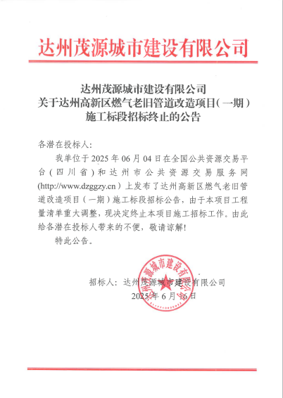达州茂源城市建设有限公司关于达州高新区燃气老旧管道改造项目(一期)施工标段招标终止的公告